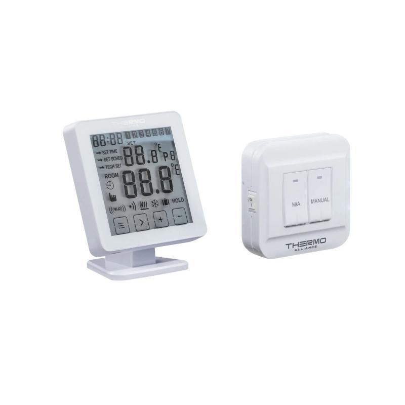 Тижневий програмований термостат Thermo Alliance ТА-2701Wi-Fi RF має два блоки: блок управління опалювальним приладом (увімкнення/вимкнення) та блок кімнатного термостата, він використовується як графічний інтерфейс користувача для визначення та контролю температури в приміщенні. Обидва блоки підтримують зв'язок радіочастотами (RF). Функція "Wi-Fi" дозволяє дистанційно керувати пристроєм за допомогою мобільного додатка ThermoAllianceSmart.